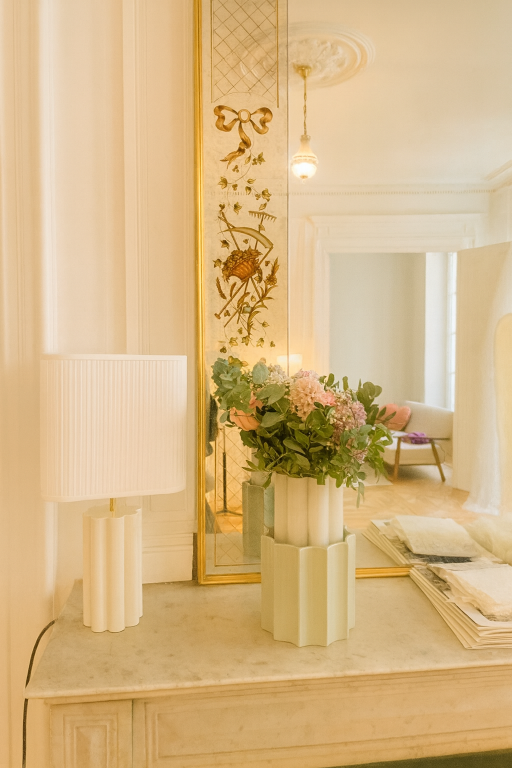 Des touches de vert amande, des velours délicats et des détails dorés viennent apporter une note couture et féminine, tout en conservant une atmosphère douce et accueillante.